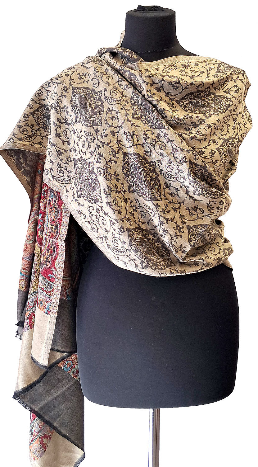 Jako úplnou novinku představujeme lehounkou, ale hřejivou šálu, která je zdobená tradičním kašmírovým vzorkem vytkaným brokátovou technikou. Zakončují ji výrazné, zdobené okraje. Je velmi příjemná na dotek i na nošení. Hodí se jak k evropskému, tak k orientálnímu oblečení.