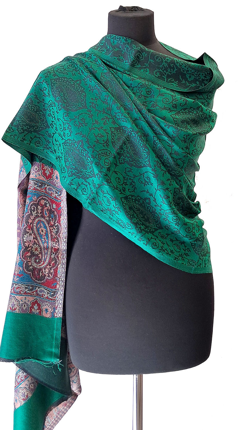 Jako úplnou novinku představujeme lehounkou, ale hřejivou šálu, která je zdobená tradičním kašmírovým vzorkem vytkaným brokátovou technikou. Zakončují ji výrazné, zdobené okraje. Je velmi příjemná na dotek i na nošení. Hodí se jak k evropskému, tak k orientálnímu oblečení.