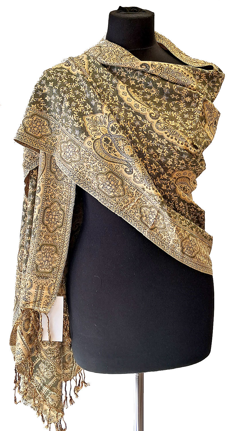 Hřejivá "kašmírová" šála z Indie - olivovo-smetanová sl3574