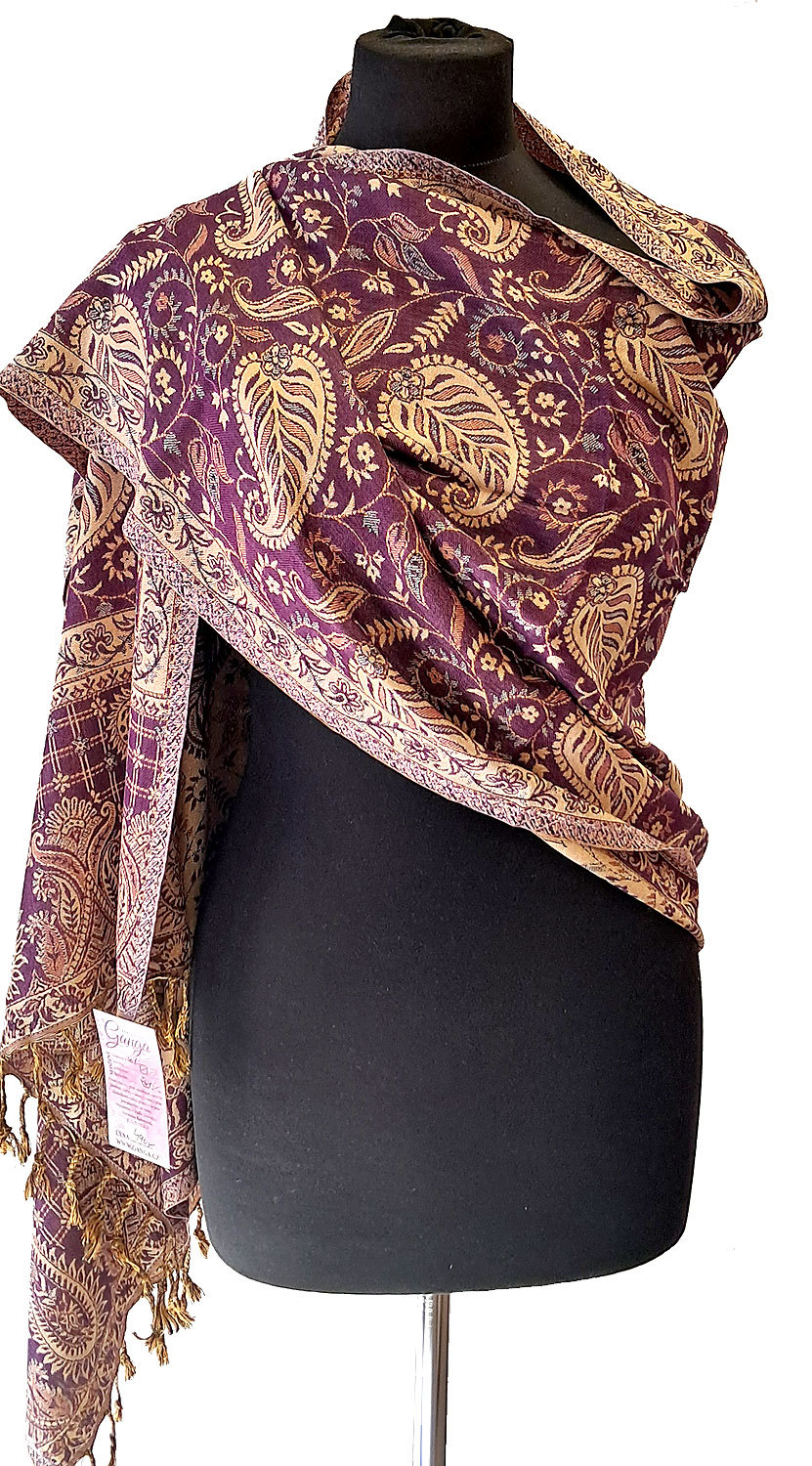Hřejivá "kašmírová" šála z Indie - ostružinovo-smetanová sl3567