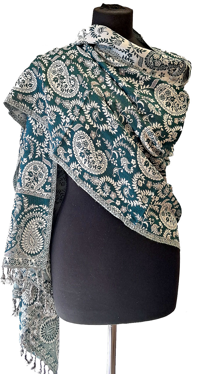 Hřejivá "kašmírová" šála z Indie - paví zelená s bílou sl3566