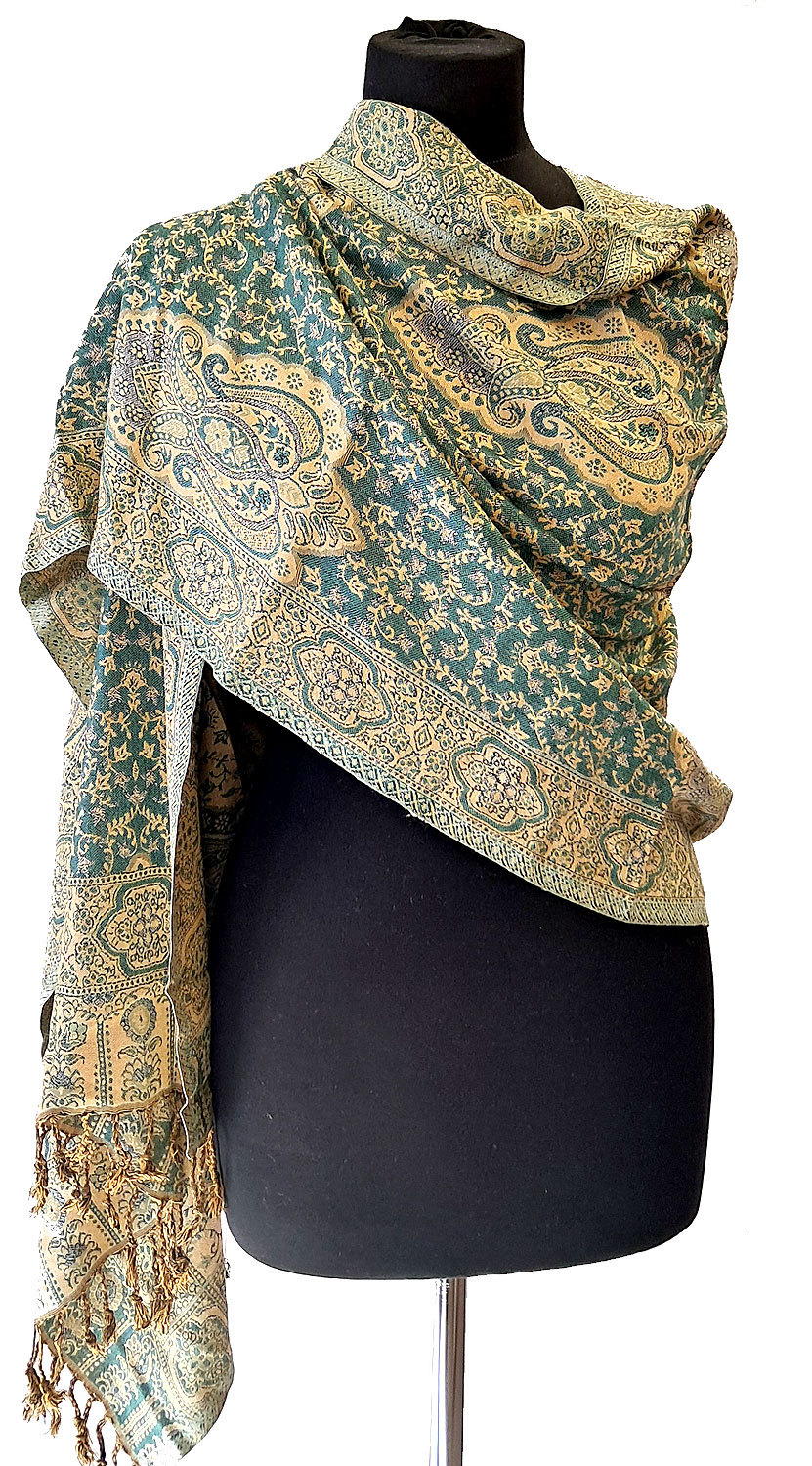 Hřejivá "kašmírová" šála z Indie - zelená - smetanová sl3573