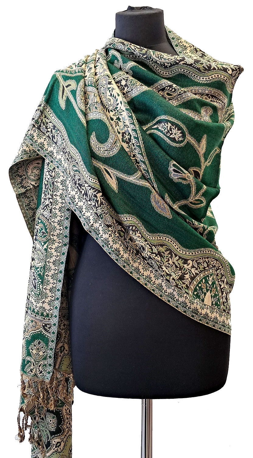 Hřejivá "kašmírová" šála z Indie - zeleno-slonovinová sl3672