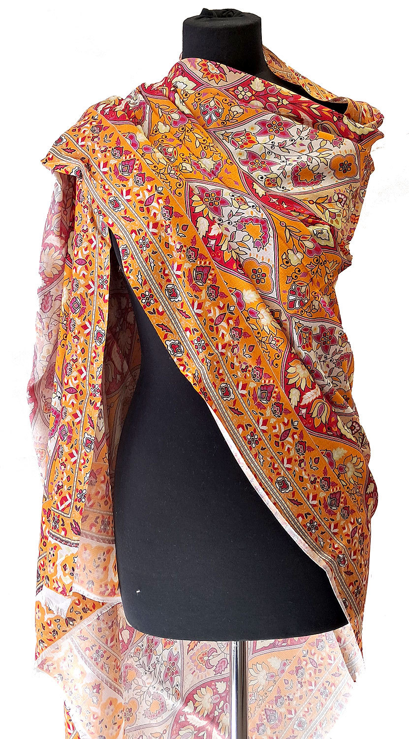 Jako úplnou novinku představujeme lehounkou, ale hřejivou šálu, nádherně zdobenou digitálním tiskem. Může se pochlubit jak nadčasovým orientálním vzorkem, tak dokonale sladěnými barvami. Je velmi příjemná na dotek i na nošení. Hodí se jak k evropskému, tak k orientálnímu oblečení.