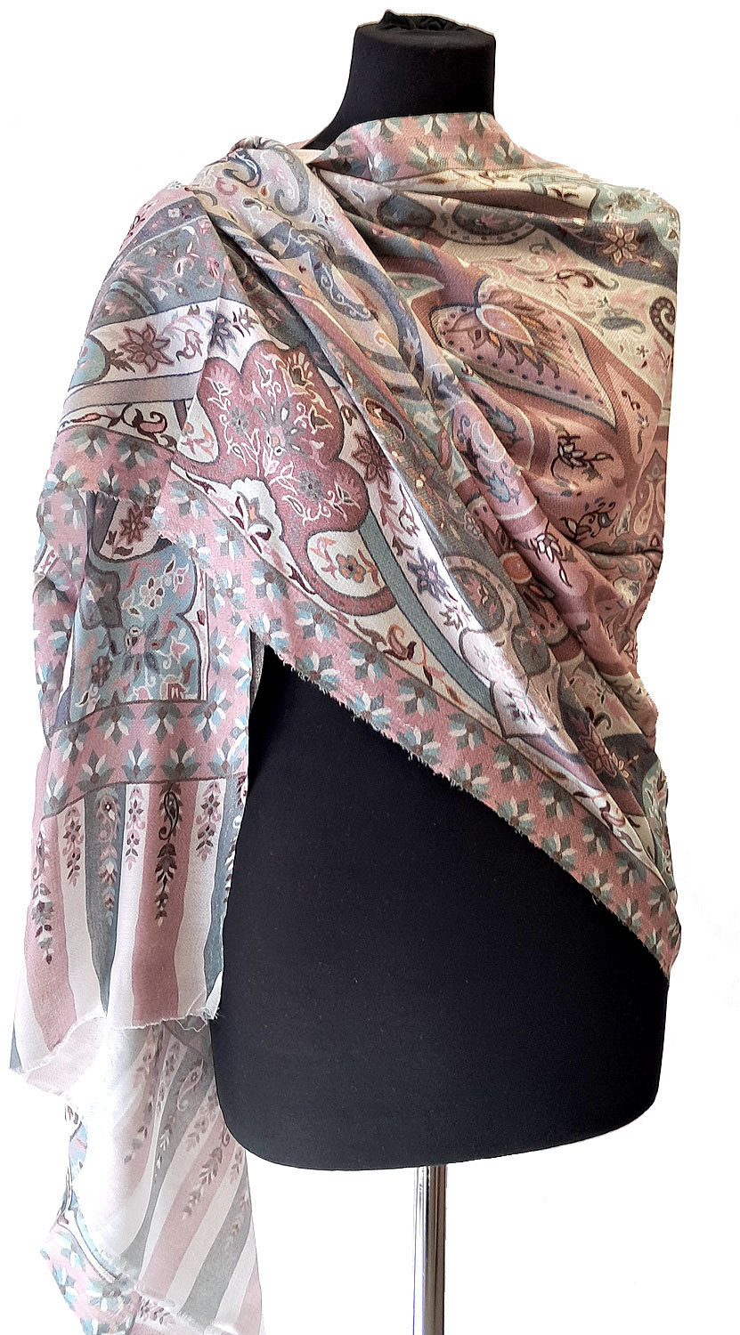 Jako úplnou novinku představujeme lehounkou, ale hřejivou šálu, nádherně zdobenou digitálním tiskem. Může se pochlubit jak nadčasovým orientálním vzorkem, tak dokonale sladěnými barvami. Je velmi příjemná na dotek i na nošení. Hodí se jak k evropskému, tak k orientálnímu oblečení.