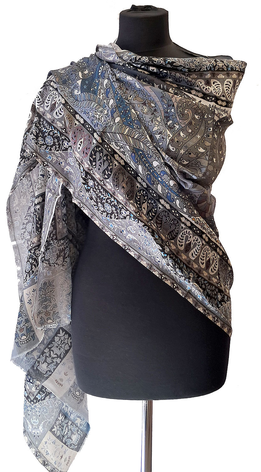 Jako úplnou novinku představujeme lehounkou, ale hřejivou šálu, nádherně zdobenou digitálním tiskem. Může se pochlubit jak nadčasovým orientálním vzorkem, tak dokonale sladěnými barvami. Je velmi příjemná na dotek i na nošení. Hodí se jak k evropskému, tak k orientálnímu oblečení.