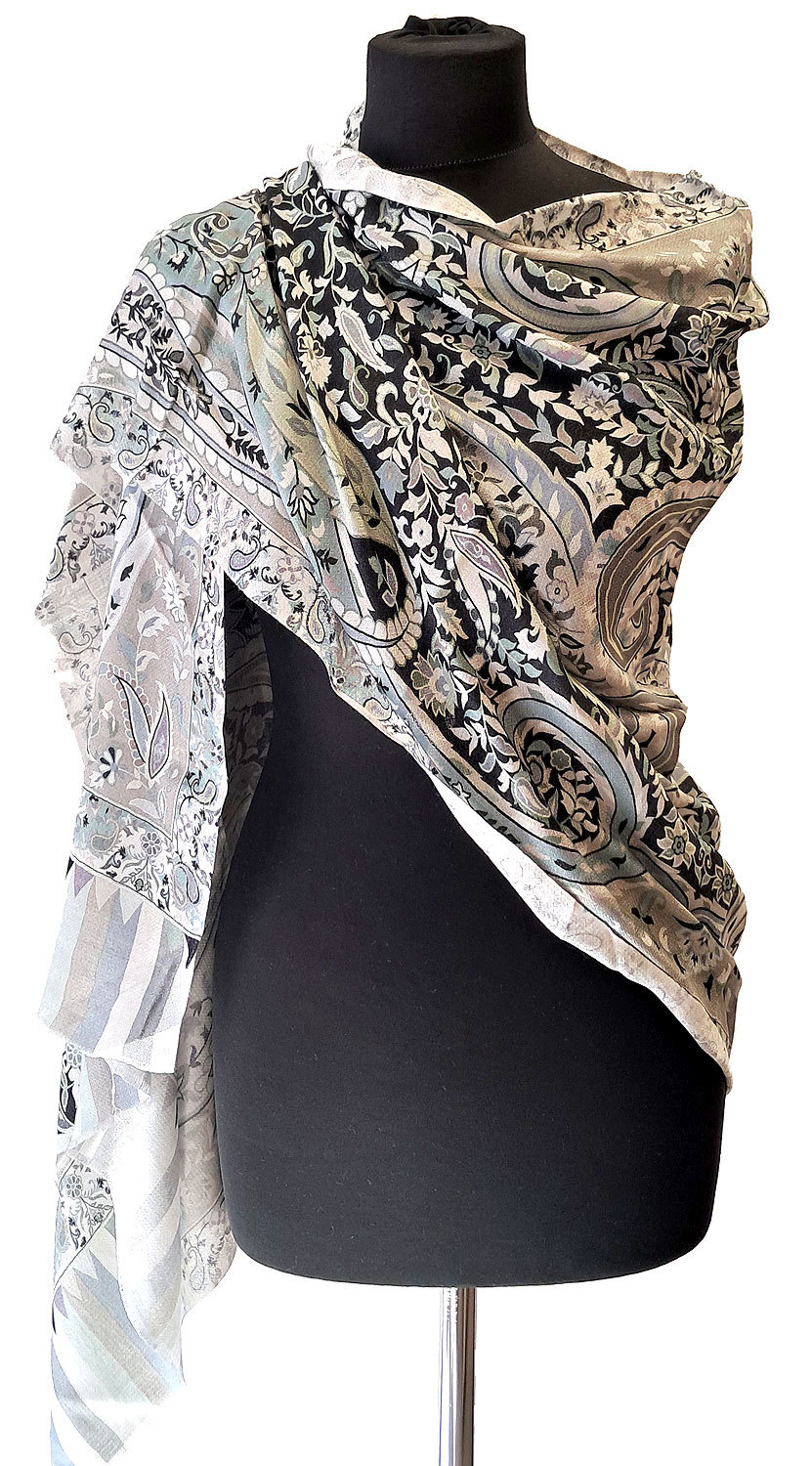 Jako úplnou novinku představujeme lehounkou, ale hřejivou šálu, nádherně zdobenou digitálním tiskem. Může se pochlubit jak nadčasovým orientálním vzorkem, tak dokonale sladěnými barvami. Je velmi příjemná na dotek i na nošení. Hodí se jak k evropskému, tak k orientálnímu oblečení.