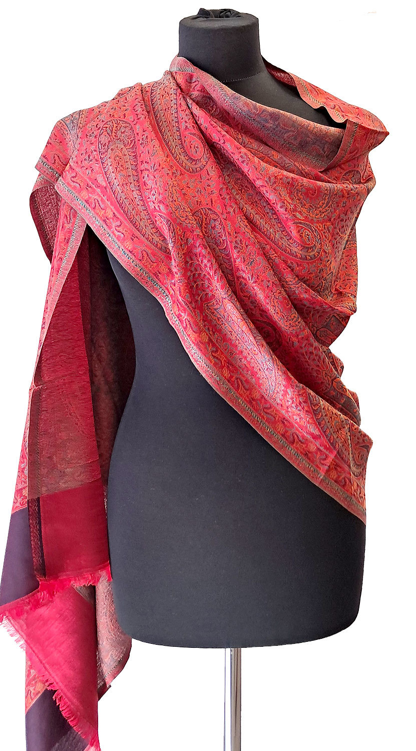 Luxusní, precizně zpracovaná šála překvapí náshedným vzorem s dokonale sladěnými barvami. Je dokonalou kopií několikanásobně dražších hedvábných šál a proto se velmi jemně leskne. Zdobí ji krásné indické ornamenty. Dokonale se hodí jak jako šála, tak jako pléd k šatům. Nádherně hřeje!