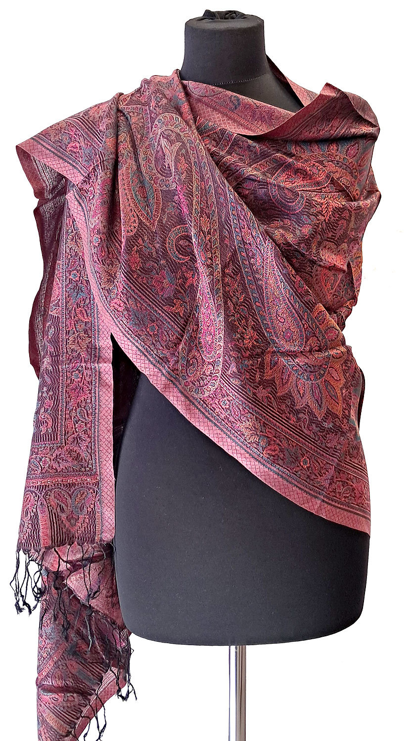 Luxusní, precizně zpracovaná šála překvapí náshedným vzorem s dokonale sladěnými barvami. Je dokonalou kopií několikanásobně dražších hedvábných šál a proto se velmi jemně leskne. Zdobí ji krásné indické ornamenty. Dokonale se hodí jak jako šála, tak jako pléd k šatům. Nádherně hřeje!