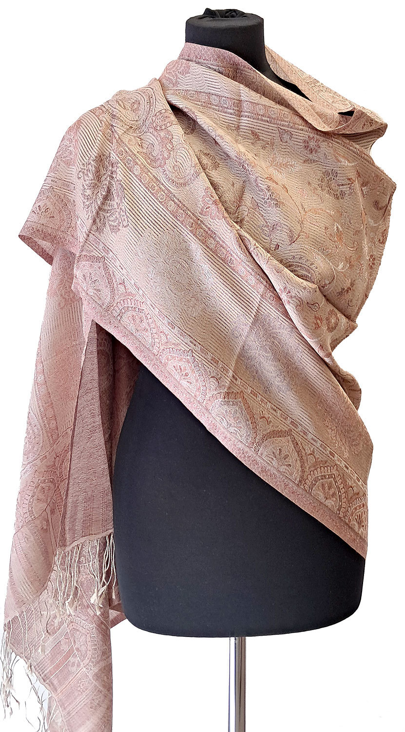 Luxusní, precizně zpracovaná šála překvapí náshedným vzorem s dokonale sladěnými barvami. Je dokonalou kopií několikanásobně dražších hedvábných šál a proto se velmi jemně leskne. Zdobí ji krásné indické ornamenty. Dokonale se hodí jak jako šála, tak jako pléd k šatům. Nádherně hřeje!