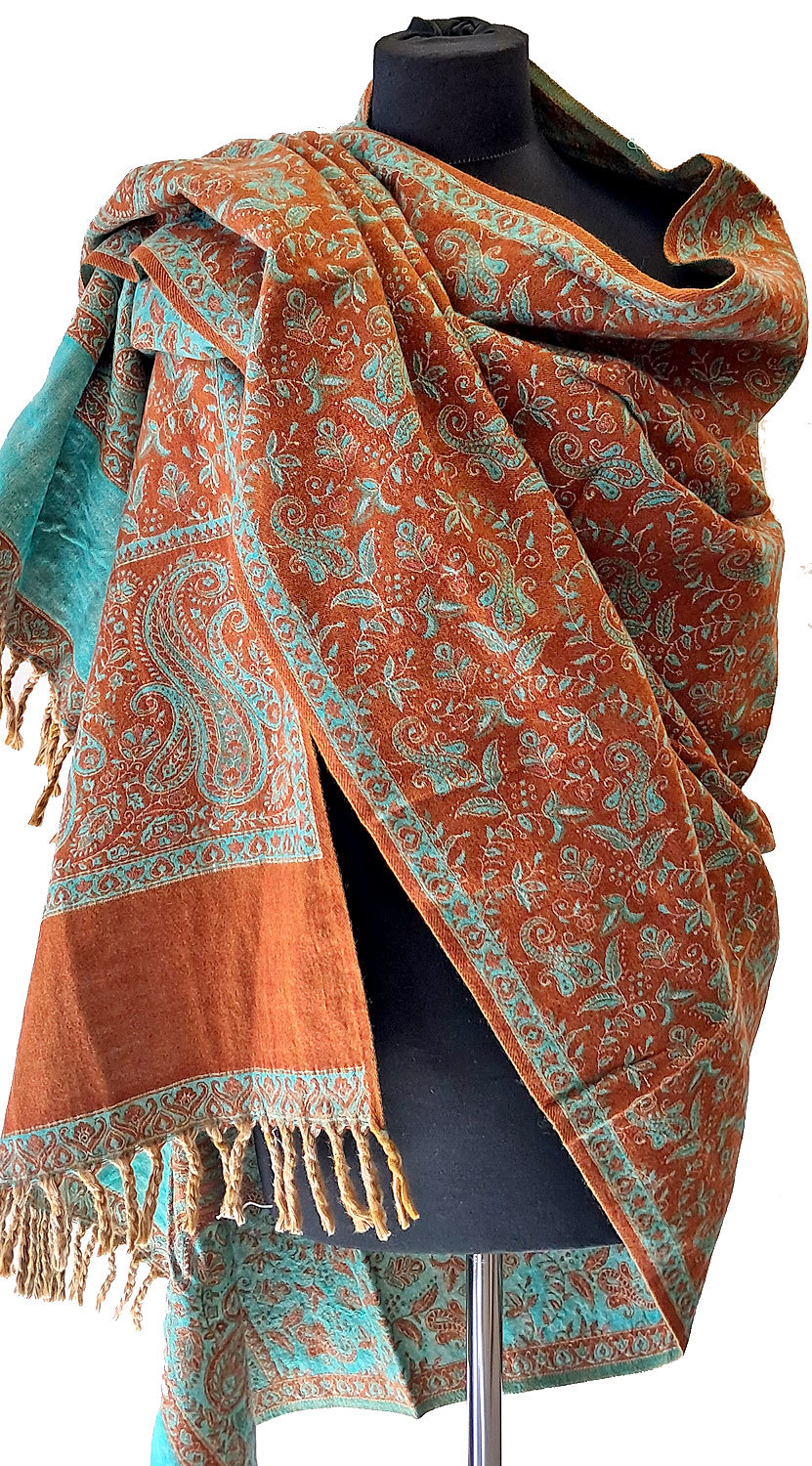 Šála s vlnou z yaka (jačí vlna) skořicovo-tyrkysová sl3583