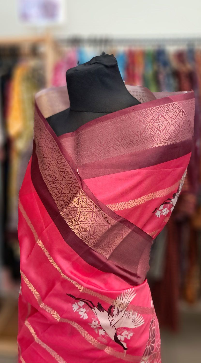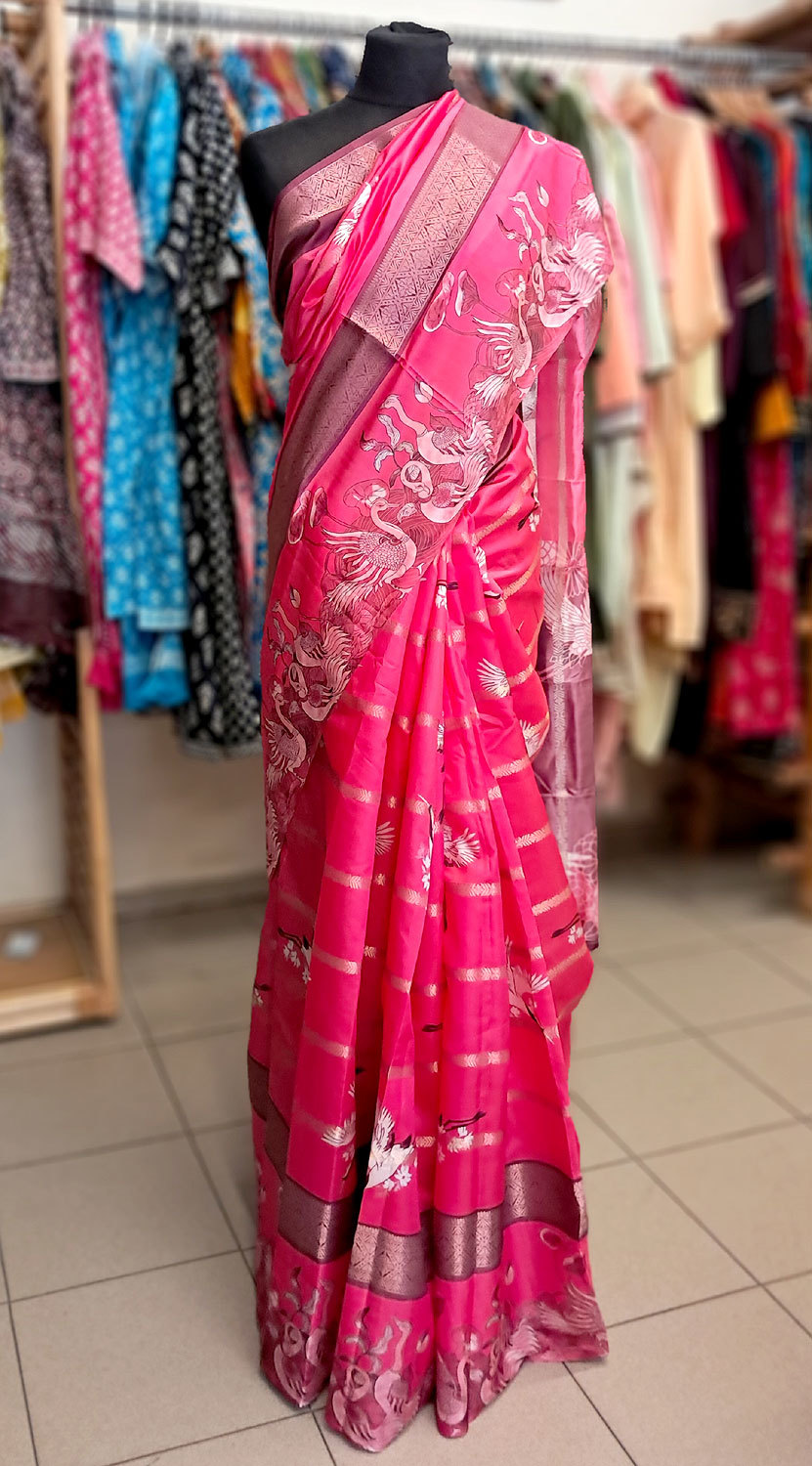 Toto jedinečné sárí spojuje eleganci indické tradice s jemnou estetikou Japonska. Zdobí jej motivy volavek a květů, které symbolizují harmonii, krásu a klid. Díky svému originálnímu designu se stává nejen nádherným oděvem, ale i univerzální látkou – můžete jej využít také k ušití kimona či jiného stylového oděvu inspirovaného Dálným východem.