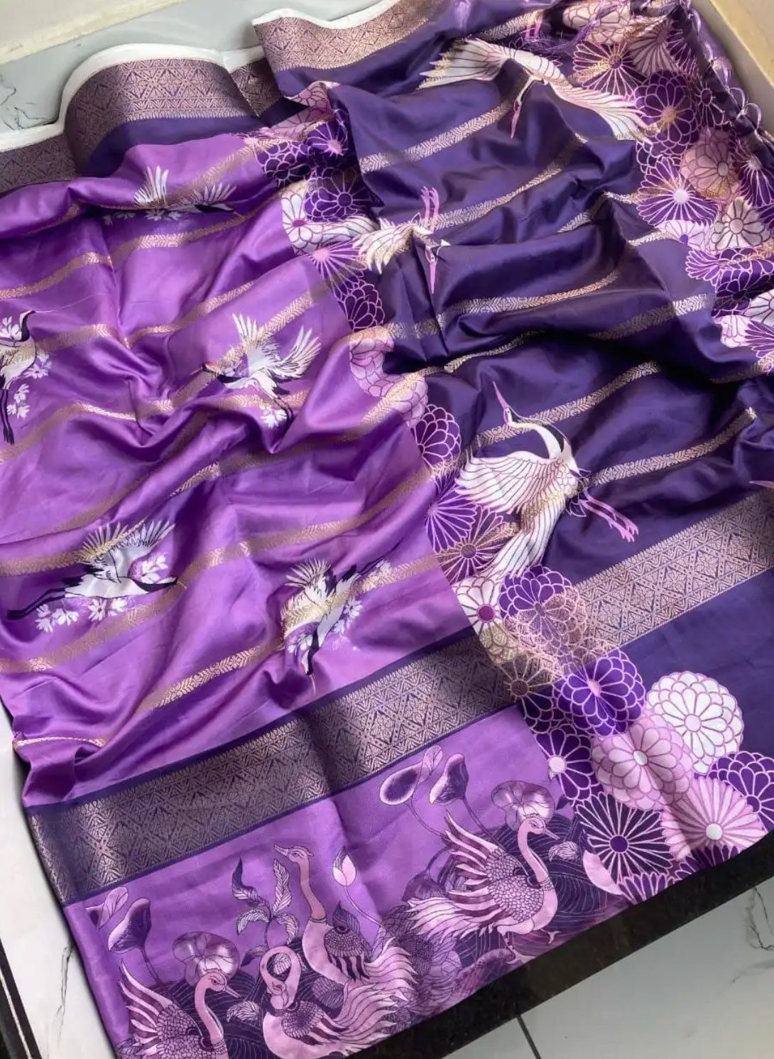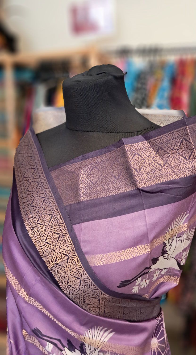 Toto jedinečné sárí spojuje eleganci indické tradice s jemnou estetikou Japonska. Zdobí jej motivy volavek a květů, které symbolizují harmonii, krásu a klid. Díky svému originálnímu designu se stává nejen nádherným oděvem, ale i univerzální látkou – můžete jej využít také k ušití kimona či jiného stylového oděvu inspirovaného Dálným východem.