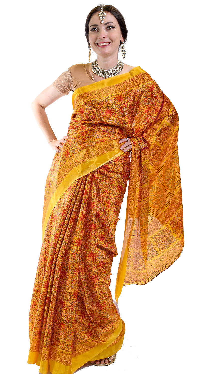 Přenádherné sárí s tradičním, staletí prověřeným vzorkem květů z Maharádžovy zahrady vás přenese do kouzelných indických pohádek. Vyrobeno je z úžasně příjemného a skvěle vypadajícího saténu.