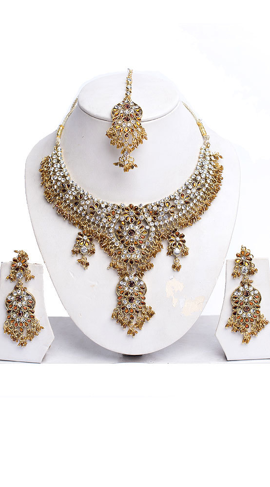 Tradiční indická sada šperků s bohatým zdobením bude vypadat skvěle i k evropskému oblečení. Souprava sestává z náušnic s řetízkem, náhrdelníku (se zapínáním na zatahovací provázek) a tikky. Vhodná je jak na bollywood, tak jako doplňek sárí či šatů - jako exkluzivní šperk k večerním šatům či na taneční vystoupení vypadá přímo božsky.